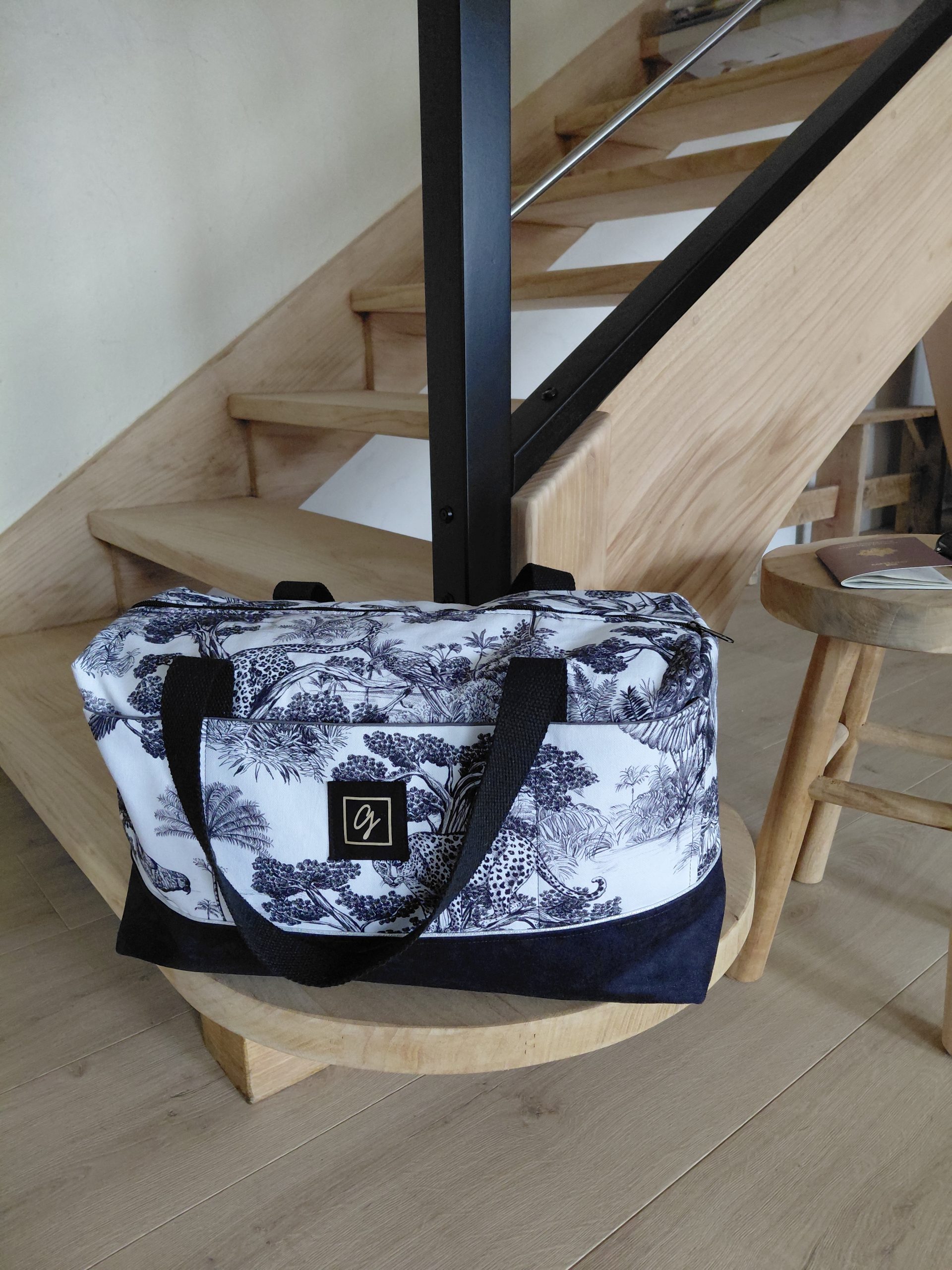 Sac week-end en toile imprimée sauvage, posé sur un escalier moderneSac week-end Toscane – Toile sauvage – Collection Échappée sauvage