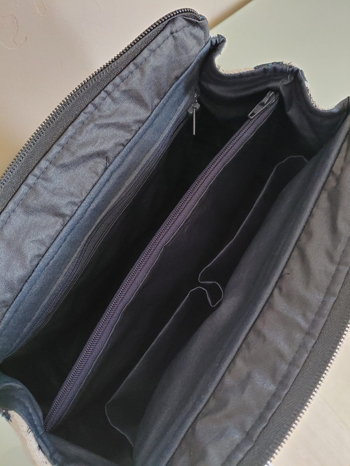 - Une poche centrale zippée qui divise la trousse en deux compartiments distincts ;